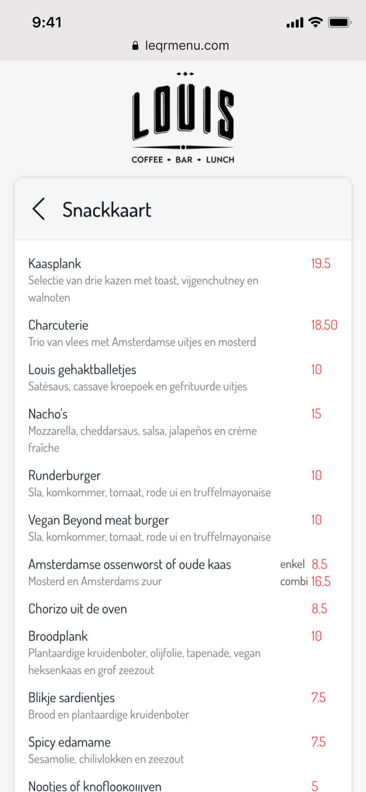 Papieren menu's zijn lastig aan te passen en worden snel vies. LEQR menu is een digitale menukaart die je gemakkelijk kunt bijwerken. Wijzigingen in prijs of beschikbaarheid zijn direct zichtbaar voor je gasten via een QR-code op tafel. En bestellen? Dat doen je gasten nog steeds bij je personeel. Wel zo persoonlijk.